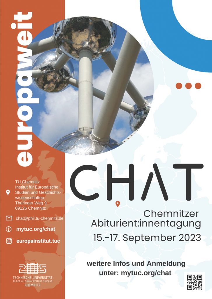 Das Institut für Europäische Studien und Geschichtswissenschaften der Technischen Universität Chemnitz (TUC) lädt vom 15. bis 17. September 2023 zur Chemnitzer Abiturient:innentagung „CHAT“ ein. Unter dem Motto „europaweit“ können Schülerinnen und Schüler über ein umfangreiches Workshop-Angebot Einblicke in die moderne Europaforschung an der TUC erhalten. Sie können zum Beispiel diskutieren über aktuelle Krisen in Europa im Hinblick auf ihre historischen Wurzeln, über die Einflüsse der Geschichte auf unsere heutige Popkultur und über Spannungsfelder der europäischen Zivilgesellschaft. Bei einer „Karl-Marx-Rallye“ können sich die Schülerinnen und Schüler bereits ein Bild von der Europäischen Kulturhauptstadt 2025 machen. Chemnitzer Studierende der Europa-Studien und der Europäischen Geschichte unterstützen das Socializing durch eine abwechslungsreiche Exkursions- und Abendgestaltung.