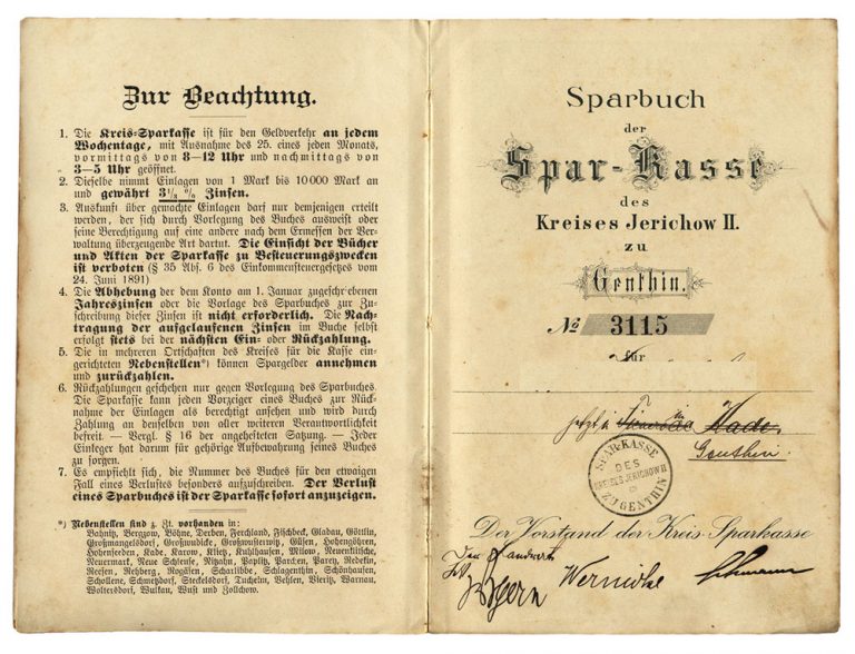 Das Erste Sparbuch wurde auf den Namen von Minna Francke, der Tochter des Oberbürgermeister Francke, ausgestellt.